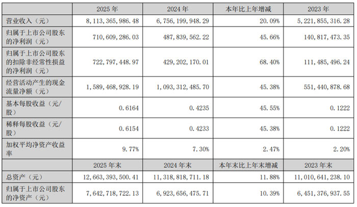 2026 年 4 月 13 日,江苏蔚蓝锂芯集团股份有限公司(股票简称:蔚蓝锂芯,股票代码:002245)正式发布 2025 年年度报告。报告期内,公司紧抓行业发展机遇,锂电池、LED 芯片、金属物流配送三大业务板块协同发展,整体经营业绩实现稳步提升,核心锂电业务保持高速增长,为公司长期高质量发展奠定坚实基础。经营业绩亮眼 营收净利双增长 2025 年,公司实现营业总收入81.13 亿元,同比增长
