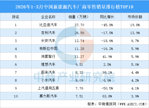 中商情报网讯:2026年1-3月,中国新能源汽车厂商新能源汽车零售销量合计140.74万辆,市场份额合计73.8%。比亚迪汽车零售销量最高达37.70万辆,市场份额19.8%。吉利汽车、长安汽车排名第二和第三,零售销量分别为26.56万辆、12.74万辆,市场份额分别为13.9%、6.7%。特斯拉中国、鸿蒙智行、理想汽车、蔚来汽车、小米汽车、上汽通用五菱、赛力斯汽车进入前十,依次排名第4-10名。