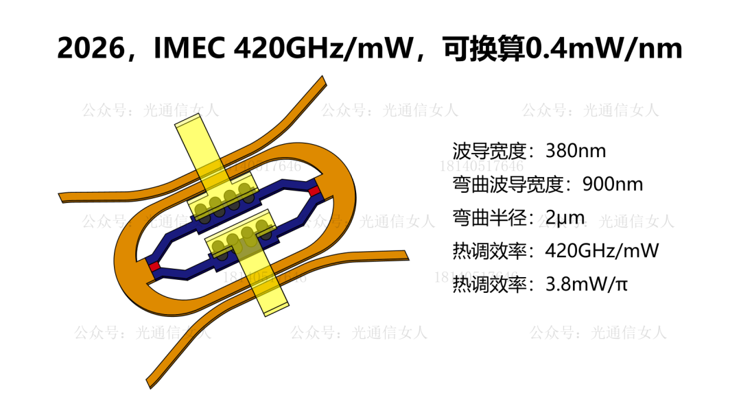 微环可以用来做调制器,同时兼顾滤波器。如Intel。也可以只用来做滤波器,如Y12T76的Celestial AI的方案,用电吸收调制器配合微环来滤波。微环呢,具有波长的温度敏感性,适合做滤波器。但是呢,其波长的温度敏感性又太强了,需要做波长锁定。热调,温度传递很慢,响应速度不够高,且还消耗功率,可但是波长的调整范围较大,支持一个FSR内的WDM跨段的调整。产业里,大多数的微环调制器或滤波器选择了热调的方案。加热器有些厂家是放在硅微环的“上方”,也有些是放在硅波导的“旁边”,比如硅环内部。找两个微环热调效率的例子。Ayarlabs是在GlobalFoundries流片的,现在也做了很多加热器的技术优化。Y12T62 Ayarlabs:微环调制器制造工艺流程的一个案例去年也写过GlobalFoundries的微环自热效应的分析,里边提到过一个热效率的数字,2.557mW/nm,如果按照O波段的1310nm来换算,每毫瓦的热调功耗可实现68.2GHz的频率调谐。2026年,IMEC也有一个热调的方式,用掺杂的硅在环内加热,热调效率很好,每毫瓦可实现420GHz频率调谐。换算到O波段的话,大约0.42mW/nm的调谐效率。IMEC这个结构用了跑道型设计,来提高耦合效率,两侧波导加宽,这个宽度理论上是多模,但可通过弯曲结构的径向模式来实现“单”模,在直波导的部分保持较窄的380nm宽度实现单模。环与环的间隔的设计,间隔很宽的话,芯片的尺寸会增大,但有利于降低相互之间的温度影响,降低热串扰。降低环的间隔距离,可提高集成度,但存在热串扰。通常的微环间隔在50μm左右。IMEC将环的间隔设计在20μm,从实验数据来看,相互的环存在温度串扰。~~,我的一些工作时间安排啊,小知识点的分享啊,放在另一个公众号里去了哈,我这个号以画图写字为主。工作技术时间安排这些事儿,可以关注一下光通信技术派。