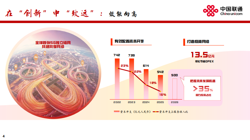 先看一组数据。2022年,联通全年资本开支742亿元;2023年,739亿元;2024年,614亿元;2025年,542亿元;2026年,预计进一步压缩至500亿元左右。五年时间,联通的资本开支压降了近三分之一。