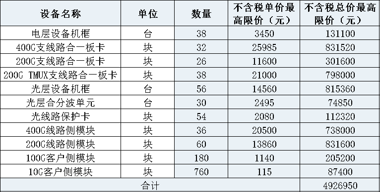 采购内容:本期采购内容为模块化波分设备,包括设备机框及各类板块,采购预算598万元(不含税),采购有效期6个月,具体采购清单详见下表: