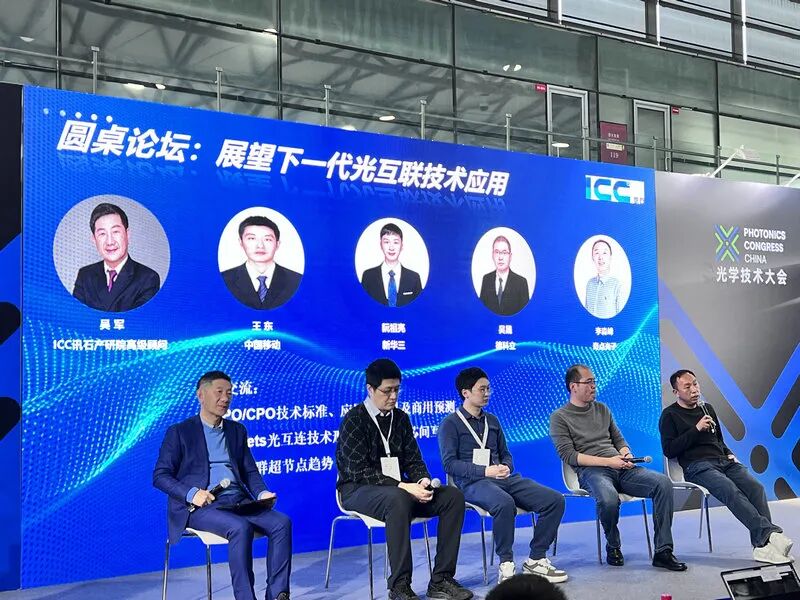 在圆桌论坛,ICC讯石产业研究院高级顾问吴军教师、中国移动研究院技术经理王东、PhotonicXAl联合创始人&CTO李淼峰、德科立光模块事业部产品总监吴晟、新华三光模块系统架构师阮祖亮再次上台交流,以主题“从Scale-Up到Scale-Out:下一代光互联技术的破局与共生”,围绕下一代光互联核心特征,NPO/CPO未来2年部署节奏与产业机会,800G/1.6T/3.2T速率跃升背后的技术瓶颈与突破路径,光互连Chiplets(光I/O)和OCS光交换中美进展展开热烈讨论