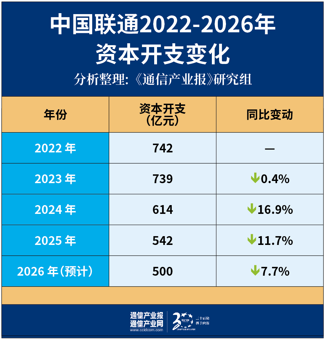 中国联通2026年资本开支预计在500亿元左右,已经连续五年下调资本开支规划。数据显示,2022年,联通资本开支为742亿元;2023年,资本开支为739亿元;2024年,资本开支为614亿元;2025年资本开支继续下调至542亿元。
