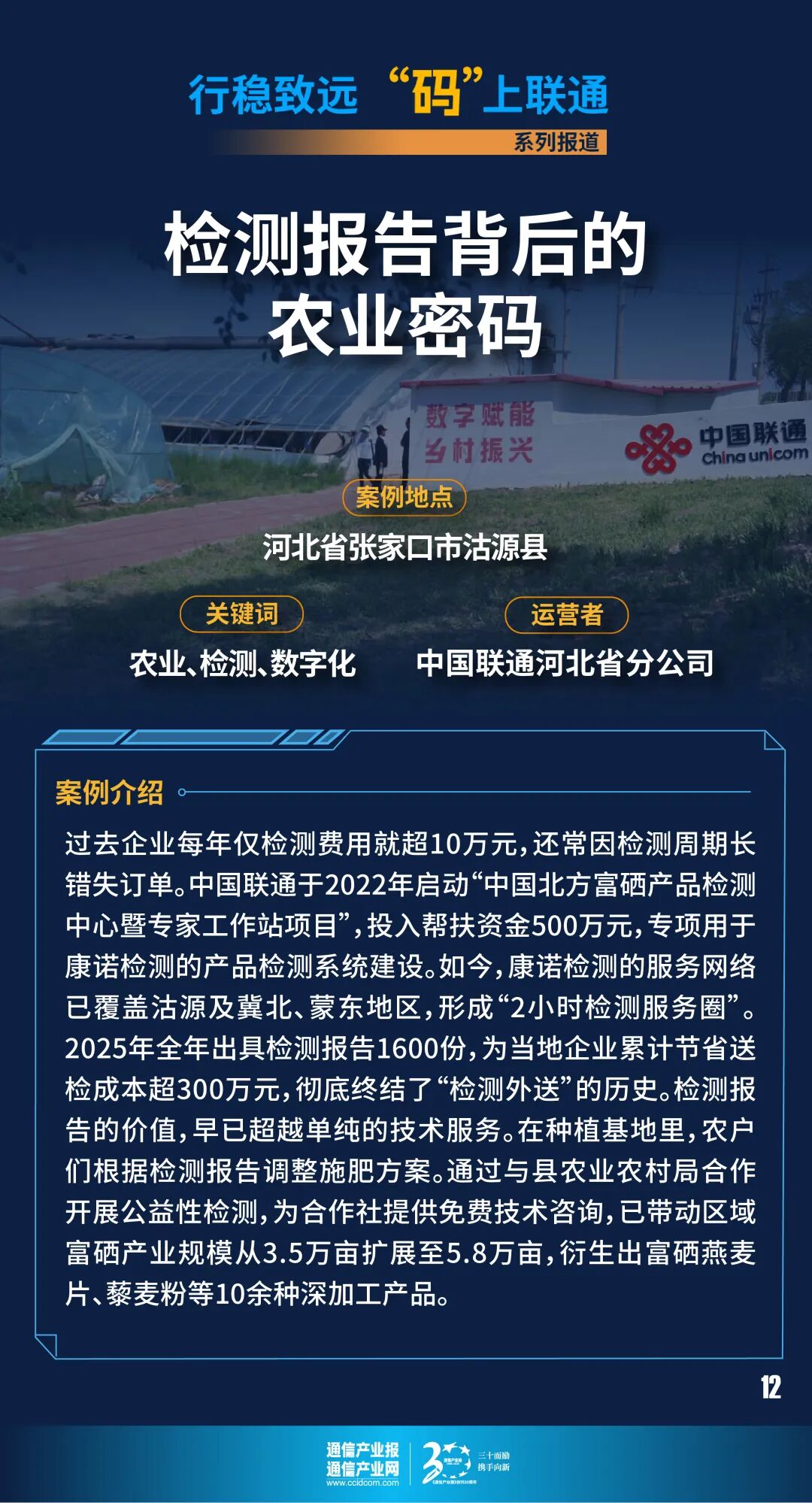 检测报告的价值,早已超越单纯的技术服务。在种植基地里,农户们根据检测报告调整施肥方案。“以前凭经验种地,现在按数据施肥,不仅硒含量达标,还减少了化肥使用量。”种植户陈大爷拿着土壤肥力检测报告说,“检测+指导”服务让他的燕麦亩产增收200元。通过与县农业农村局合作开展公益性检测,为合作社提供免费技术咨询,已带动区域富硒产业规模从3.5万亩扩展至5.8万亩,衍生出富硒燕麦片、藜麦粉等10余种深加工产品。“未来我们计划新增中药材检测项目,对接冀北、蒙东的中药材产业带。”谈及发展规划,王智渊思路清晰,“作为农业检测标杆,我们要让数据成为产业升级的‘通行证’,助力区域特色农业在高质量发展的道路上走得更稳、更远。”展望未来,中国联通将继续发挥数智优势,在数字农业、产销对接等领域深化合作,让这份“检测密码”持续为乡村产业振兴注入新动能。文:陈红 高英杰