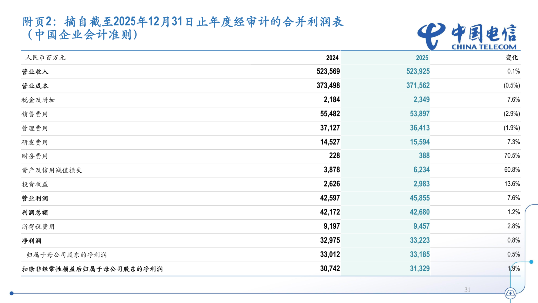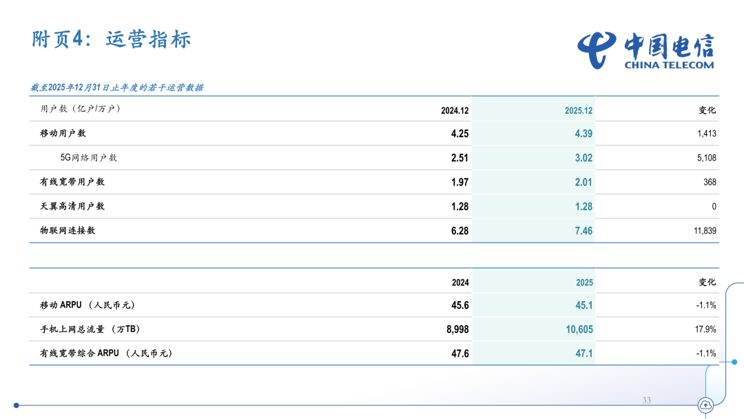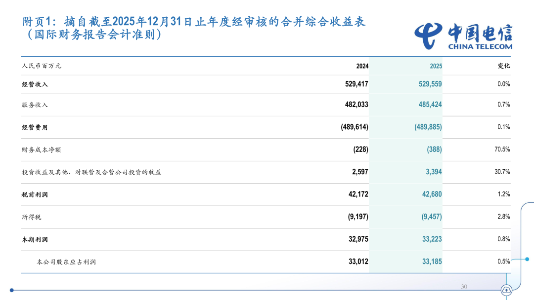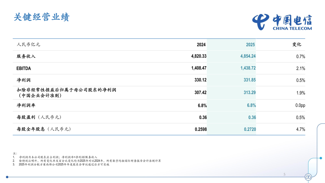 2025年,中国电信完整、准确、全面贯彻新发展理念,积极服务和融入新发展格局,坚定履行建设网络强国、科技强国、数字中国和维护网信安全的责任,准确把握科技创新和产业发展趋势,全面拥抱人工智能,推动企业战略从“云改数转”向“云改数转智惠”升级,高质量发展迈出新的坚实步伐。2025年,中国电信经营收入为5296亿元,其中服务收入为4854亿元,同比增长0.7%。中国电信持续推动创新引领的基础和产数业务双轮驱动融合发展。2025年,基础业务收入达到3,305亿元,同比增长0.7%,移动用户达到4.39亿户,5G网络用户渗透率达到68.8%,宽带用户达到2.01亿户,千兆用户渗透率达到31.6%。产业数字化业务收入达到1,473亿元,同比增长0.5%,其中资源型收入达到630亿元,同比增长1.1%。战新业务继保持较快增长,天翼云收入达到人民币1,207亿元,公有云laaS市场份额升至国内第二,laaS+PaaS市场份额居国内前三;AIDC收入达到人民币345亿元,安全收入达到人民币166亿元,智能收入达到人民币123亿元;视联网收入同比增长31.2%,量子收入同比增长65.4%,卫星收入同比增长30.7%。据介绍,中国电信在充分考虑盈利、现金流水平及未来发展资金需求后,董事会决定向年度股东会建议,公司2025年度以现金方式分配的利润为本年度本公司股东应占利润的75%,每股派发末期股息人民币0.0908元(含税),连同2025年中期已派发股息每股人民币0.1812元(含税),2025年全年派发股息为每股人民币0.2720元(含税)。2025年,中国电信净利润为332亿元,同比增长0.5%。