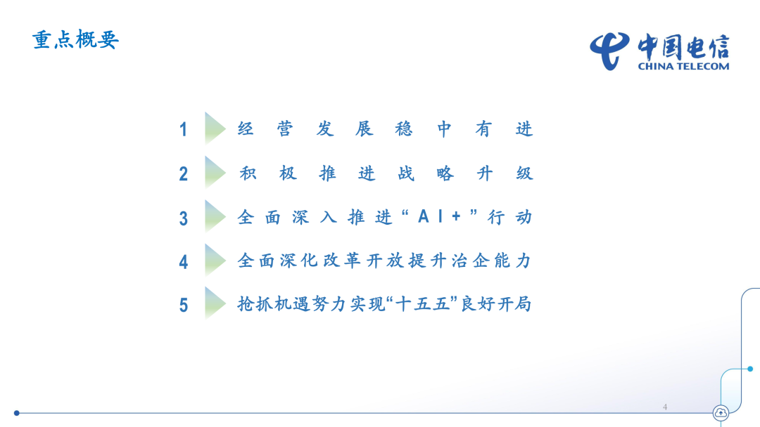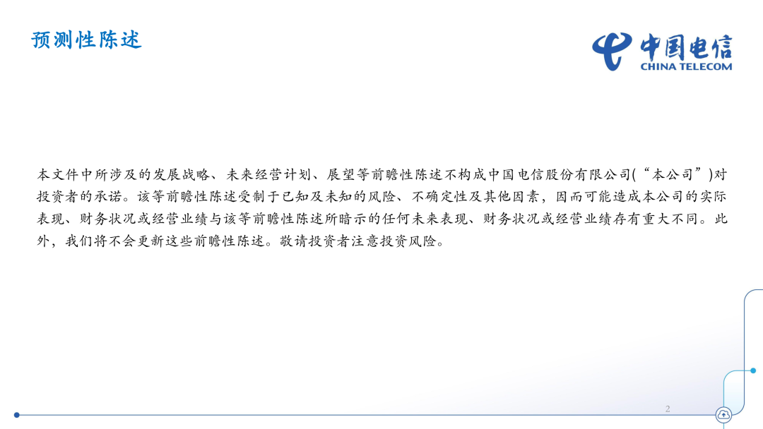 中国电信深刻认识到人工智能带来的颠覆性变革,抢抓机遇,乘势而上,推进企业战略升级,构建完成并持续深化“五位一体”智能云体系,深入推进“人工智能+”行动,全力打造“三型”企业。加快推进高水平科技自立自强,集中力量攻关“息壤”第一科技,聚焦四大根技术,持续加大关键核心技术攻关,研发费用达到156亿元,同比增长7.3%,科技创新成效显著。公司以第一科技“息壤”为核心,发挥云网融合优势,加快核心技术攻关,构建完成并持续深化“算力、平台、数据、模型、应用”一体化的智能云体系。在IaaS层,实现从基础算力底座向AI原生算力底座全面升级,依托“通智超量”一体弹性计算、AI统一数据存储及AI高性能云网络,实现云智一体的算存网协同效能大幅提升,形成高并发、高吞吐、高算效的AItoken规模化生产能力。在PaaS层,打造Triless平台架构,实现资源、框架、工具三重解耦,截至目前自有及接入智算总规模达到91EFLOPS,突破多级缓存、异构计算、模型路由优化等技术,为各类大模型提供工具服务。在DaaS层,打造高质量数据集和可信流通工具链,推进自有、开源和第三方数据集深度融合,汇聚超10万亿token的通用大模型语料数据和覆盖超14个行业的高质量数据集,总量超500TB。在MaaS层,持续强化央企首个“全模态、全尺寸、全国产”的星辰大模型体系,在语义、语音、视觉与多模态等领域形成行业领先优势。在SaaS层,打造标准化AI产品体系,推出适配多场景需求的行业大模型与智能体服务,让AI更加灵活触达、便捷可用,持续赋能经济社会数智化转型发展。公司全面深入推进“AI+”行动。持续将AI融入自身生产经营的核心环节,构建包含智能客服、智能营销、智能运营、智能研发、智能管理五大领域的AI应用场景图谱,累计上线应用超250个,用AI变革企业工作流程,全面提升运营效率。打造超110个行业大模型和超350个行业智能体,形成覆盖工业、政务等15类行业AI应用标准范式,服务超3.7万家行业客户,打造国资央企“AI+”行动示范基地,牵头建设国资央企领域可信数据空间和算力池,央企AI渗透率达85%。深耕量子通信、量子计算与量子精密测量领域,加快全栈式量子产品落地,量子通信用户规模突破680万户,服务政务、金融、能源等领域行业客户超5.000家;实现量子计算真机部署、云平台应用、量子信息教育三大应用场景产品化,为高校提供量子算力与学科教研支持;加速量子精密测量技术从“工程化”到“市场化”进程,在地质勘探等典型场景中部署应用。前瞻布局低空经济新赛道,打造全新升级的AI+“1+1+4+N”低空经济能力体系,形成千余个应用场景,面向低空基础设施、运行监管、安全防护和智能作业等场景提供一站式解决方案,产品已在160余座城市落地,全面提升低空运行的数字化、智能化和安全化水平,助力低空经济“飞得安全、飞得高效”。公司始终将安全发展贯穿企业生产经营各环节,不断健全制度体系,扎实提升治理能力,着力打造技术底座,持续优化服务保障,筑牢网络和信息安全防线。高度重视AI安全治理,围绕环境、数据、模型、内容、应用持续完善AI安全治理框架,发布业内首部《AI智能体安全治理白皮书》,持续升级全方位人工智能动态防护体系。打造卓越安全产品、一流安全服务和行业级安全集成能力,为客户提供更加丰富可靠的安全保障,构建以云堤抗D、云脉零信任、安全大脑、云镜主机安全等为核心的产品矩阵,加快安全融智。推出国内首款运营商级智能体安全解决方案一天翼智安,以全流程管控、实时防御、行为溯源能力助力用户构建OpenClaw类智能体安全解决方案。公司深化“网是基础、云为核心、网随云动、云网一体、智惠共生”的发展理念,加快推进适应AI时代的数字信息基础设施升级,锚定全国一体化算力网,推动算、存、运、AIDC、电一体化布局和升级。推动算力资源高效协同,自有智算能力达46EFLOPS。紧密围绕“东数西算”战略优化布局,在国家枢纽节点适度超前储备机楼、电力、能耗等资源,按照“两高两活”建设标准,打造高效、绿色、智能的算力底座,机架功率规模超3.2GW,高功率机架总功率同比增加超35%,积极开展海外AIDC布局。深化算电协同发展,推进供电架构升级,探索新型供电模式,率先打造4个全国性标杆。公司持续推进空天地一体、国际国内一体的信息通信网络基础设施演进升级。打造千兆光网10GPON端口超1,000万个,城镇千兆住宅覆盖率超97%。积极推进新一代高轨移动通信卫星及高轨高通量卫星立项建设,开放共享天通业务,启动北斗短信商用试验。构建“一轴两翼三网四中心”国际网络体系,推进昆明、海口全业务出入口局建设,主导建成近五年首条登陆中国大陆的亚洲直达(ADC)国际海缆,积极服务“一带一路”方向业务拓展。打造高中低频协同、5G/4G融合的共享网络,持续为全球贡献中国智慧和中国方案。2026年是“十五五”开局之年,我国经济基础稳、优势多、韧性强、潜能大,长期向好。新一轮科技革命和产业变革加速演进,智能化、绿色化、融合化成为我国现代化产业体系建设的发展方向,“人工智能+”全方位深化拓展,智能经济新形态加快形成,催生出广阔而蓬勃的市场空间。公司将抢抓发展战略机遇,全面实施云改数转智惠战略,持续深化“五位一体”智能云体系,以打造领先的AI服务商为目标,以token服