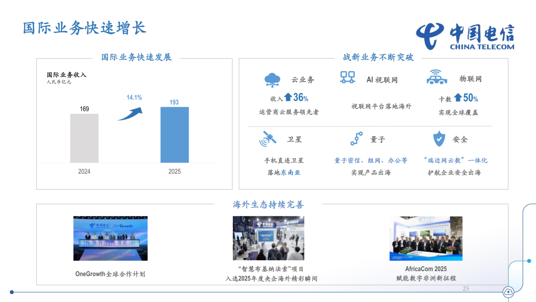 面向国际用户,持续推动国际业务高质量发展,稳步推进全球云网基础设施与生态体系建设,继续深化境内外一体化协同,强化云、AI 视联网、物联网、卫星、量子、安全等战新业务海外场景适配和推广,积极拓展一带一路沿线市场。2025 年,国际业务收入达192.6亿元,同比增长14.1%。