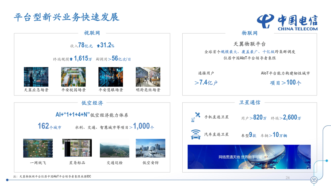 面向个人客户,持续推进连接体验升级,聚焦直播、赛事等细分市场需求,加大 5G-A 精准覆盖与规模商用,丰富 5G-A 套餐权益内涵,全力打造新一代通信服务体验。持续推进个人应用升级,依托智能体加大产品创新重塑力度,升级 AI 通话智能体,打造多款 AI 手机终端,升级音乐智能体,推出天翼智铃等生成式音视频彩铃服务,发布云智手机等 AI 应用,打造个人生活智能体,持续迭代 AI 云电脑、AI 云盘等产品,赋能用户开启 AI 生活“智惠”新篇章。持续推进全域泛在的“天地一体”通信服务,加快卫星连接用户规模拓展,加大可覆盖区域卫星业务海外推广力度,推动卫星服务普及。