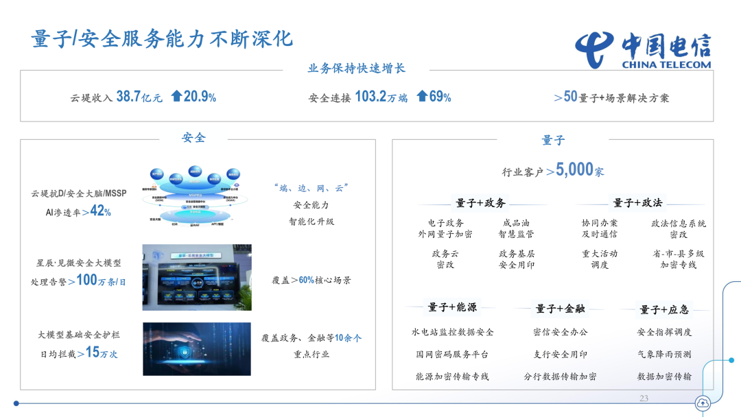 面向政企客户,持续推进算力全面发展,不断夯实基础网络,打造入算、算间、算内协同的算力互联网络,打造一云多芯、一云多态、一云多算的云底座和云智一体的全栈能力,截至目前自有及接入智算总规模达到 91EFLOPS;持续推动人工智能场景应用,依托“息壤”算网一体服务平台,成功打造超 110 个行业大模型和 350 个行业智能体,服务客户超过 3.7 万家,深入推进央企“AI+”行动,打造国资央企 AI+行动示范基地,牵头打造国资央企算力池以及国资央企领域可信数据空间,央企人工智能渗透率达到 85%;持续提升行业平台能力供给,重点打造“星辰”系列平台产品,赋能工业、教育、医疗、政务等客户数字化转型升级,16个平台进入行业TOP5;持续增强 5G 定制网全场景服务能力,面向制造、核电、港口、轨交、低空、校园、车企等行业客户打造 10 大场景化专网解决方案。