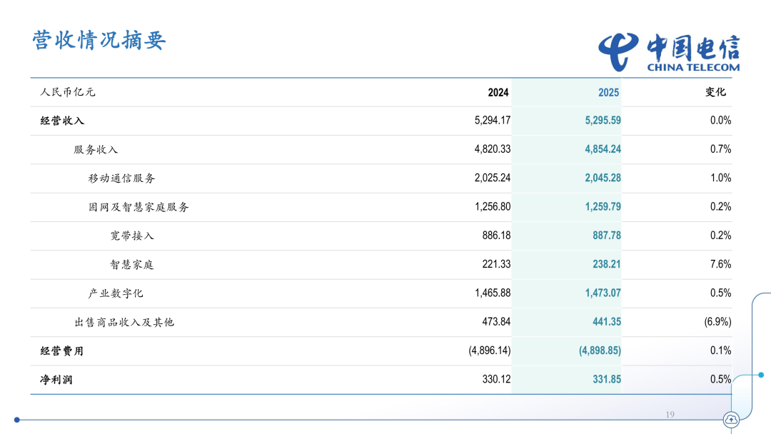 2025年3月24日,中国电信发布2025年业绩。2025年,中国电信经营收入为5296亿元,其中服务收入为4854亿元,同比增长0.7%。EBITDA为1439亿元,同比增长2.1%。净利润为332亿元,同比增长0.5%,每股基本净利润为0.36元。资本开支为804亿元。自由现金流为447亿元。