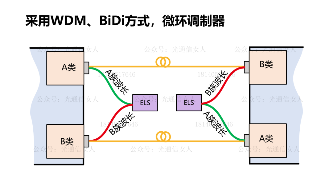 2026年OFC期间,OCI MSA成立,有AMD,博通、Meta、微软、英伟达这些厂。发布了第一个规格,每方向200Gbps的信号,波分复用,4x50=200,且明确提出调制器的类型是微环。光引擎在系统板内的位置,可以是OBO的载板光学,这个距离也经常用来称呼“NPO”。光引擎也可以与ASIC共封装,分为两类,共基板封装,也就是产业默认的CPO,另一个共封装是与ASIC共“中介板”封装,也就是下一代的CPO,或者也有厂家称之为IPO共基板封装以及共中介板封装,工艺难度和功耗有区别,Y11T323 TSMC:CPO封装工艺路线演进及功耗这个写的比较详细,可参考一下。OCI的MSA,需要采用BiDi方式,这个Bidi与谷歌OCS的Bidi不一样。谷歌OCS的bidi,是同一族波长的双向传输,就是从A到B是1234波长,从B到A还是1234波长,这种方式会产生带内干扰,但波长管理很简单,产业链也简单。OCI的bidi是两族波长的双向传输,也就是就是从A到B是1234波长,从B到A还是5678波长,这种方式很容易通过滤波器做上下行信号的隔离,但需要较为复杂的波长管理以及产业链管控。OCI的MSA,通过1310附近的A族波长,以及1330附近的B族波长,做了bidi的两个方向的隔离。bidi的每个方向4波长复用4x50G=200Gbps,波长间隔2.2nm,换算成频率间隔就是400GHz。~多啰嗦一句,上边一段话出现了200G和400G,这俩不是一回事儿啊,200Gbps是信号的比特速率,400GHz是载波的频率间隔,(1308nm=229.2THz,1310.28nm=228.8THz,这两个波长的间隔229.2-228.8=0.4THz),0.4THz=400GHz,一个说的信号,另一个说的是载波。外置ELSFP激光器模块提供两族波群,每族包括四波长,用于适配四个微环调制器,第一代的调制格式NRZ。第一代OCI,200Gbps/方向未会提高到第二代400Gbps/方向。这周给我派的活儿,3月28号硅光专题,微环调制器很少厂家选择铌酸锂材料或者是InP材料,绝大多数的微环调制器采用硅来制作。一些时间计划的技术解析类安排以后就放到菲魅的一个公众号。
