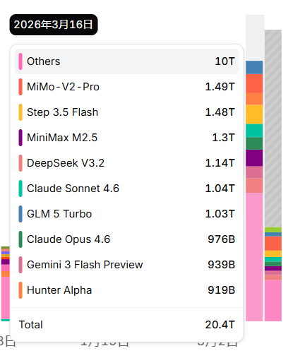 3月16—22日OpenRouter全球AI大模型Token周调用量排名情况。