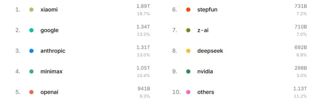 事实上,随着中国人工智能技术竞争力持续增强,中国AI大模型及相关企业在全球的影响力也不断提高。据OpenRouter数据,3月16—22日当周,有五家中国企业AI大模型的Token周调用量进入前十,其中小米公司AI大模型系列的Token周调用量达1.86万亿,占比18.7%,排名首位;MiniMax、阶跃星辰、智谱、深度求索AI大模型系列的Token周调用量分列第四、第五、第七和第八位。