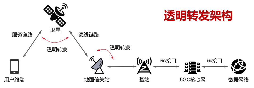 卫星透明转发架构中,卫星仅作射频信号中继,不进行任何信号处理。地面的NTN网关等设备,负责执行信号解调、译码与协议栈处理等核心功能,是连接卫星与地面核心网的关键枢纽。