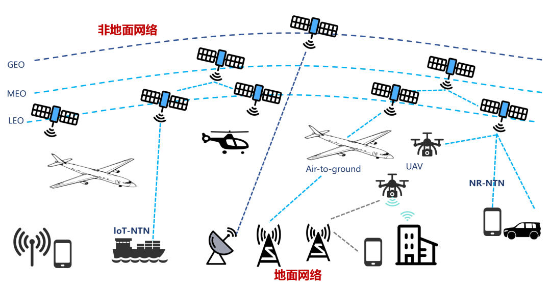 严格来说,NTN包括了卫星(LEO低轨道、MEO中轨道、GEO地球静止轨道)、高空平台(High-Altitude Platforms,HAPS,例如平流层飞艇、气球)、无人机,甚至未来的月球通信中继节点等多种层次的通信网络体系。