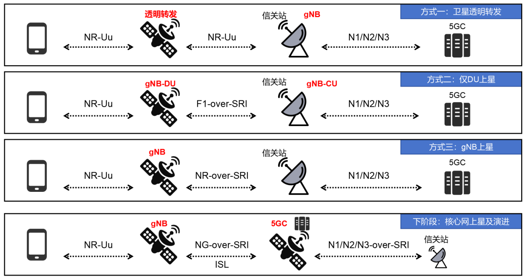 需要注意的是,再生转发架构,可以在卫星上实现全部gNB(5G基站)功能,也可以实现部分功能,由需求和场景来决定。例如,将5G基站的DU(分布式单元)功能集成到卫星上,CU(集中式单元)功能则部署在地面,形成“星上DU+地面CU”的混合架构。