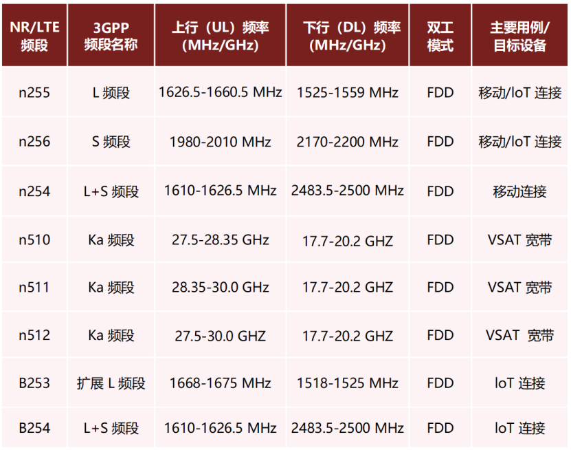 Release 17 的工作主要集中在使用透明有效载荷,并在FR1内的n255(L频段)和n256(S 频段)进行操作。这两个频段也是传统卫星通信的基础频段。说白了,都是为了能够快速适配。两个频段的频宽不大,所以支撑不了大带宽的业务,主要实现基础业务。