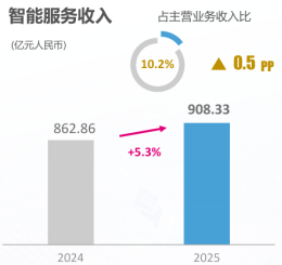 智能服务创新突破。智能服务是中国移动赢得未来竞争的制高点。中国移动深化落实“人工智能+”行动,在数智生活、数智生产、数智治理场景发挥创新牵引作用。升级九天基础大模型3.0,推出超100款AI+产品及应用解决方案、29款垂类智能体,自主打造高质量数据集3500TB,数据算法收入同比增长12.6%,数智文化收入同比增长13.3%。重点布局超50款自研行业大模型,联合能源、水利、农业等行业龙头共建行业大模型,赋能新型工业化走深走实。2025年智能服务收入良好增长,完成人民币908亿元,同比增长5.3%。