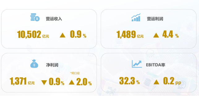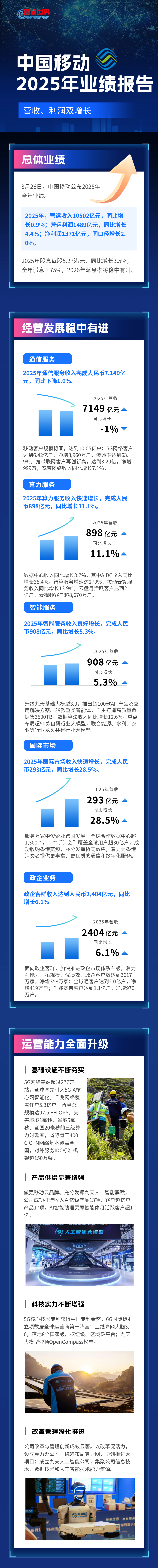 3月26日,中国移动发布2025年财报。财报显示,2025年中国移动营运收入达到10502亿元,同比增长0.9%;主营业务收入8955亿元,同比增长0.7%,其中通信服务收入占主营业务收入比为79.8%;营运利润1489亿元,同比增长4.4%。