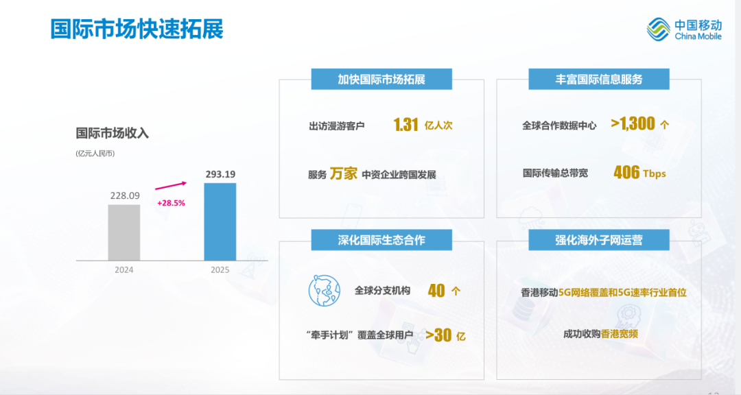 中国移动国际市场收入达293.19亿元,同比增28.5%。