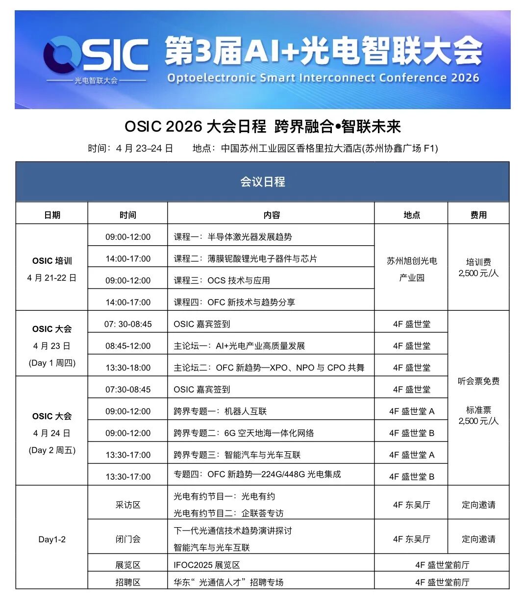 4 月 21-24 日,ICC 讯石在苏州举办OSIC 2026 第 3 届 AI + 光电智联大会,以技术培训、主论坛 + 跨界专题、人才招聘 / 新品展示等多元形式,聚焦 AI 算力光通信产业与商业航天、自动驾驶、低空经济等跨界场景,共话光电产业新增长。