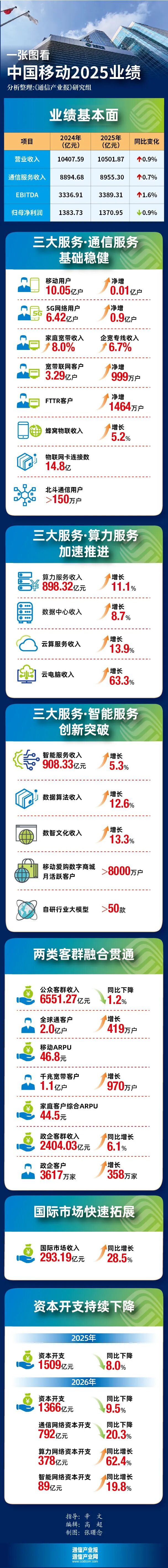 0.9%!中国移动2025年业绩出炉(附完整PPT)再降9.5%!中国移动2026年资本开支1366亿元中国移动:加强Token运营,“十五五”算力收入要翻番