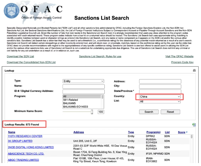 这意味着,被列入制裁清单的机构不仅无法在这一全球顶级平台上发表研究成果,其科研人员也将被完全排除在会议的组织和运行体系之外,彻底失去学术参与权。根据公开数据,仅以"中国"为筛选条件,OFAC制裁清单上相关条目就达873条,涵盖了中国AI领域的核心力量,包括: