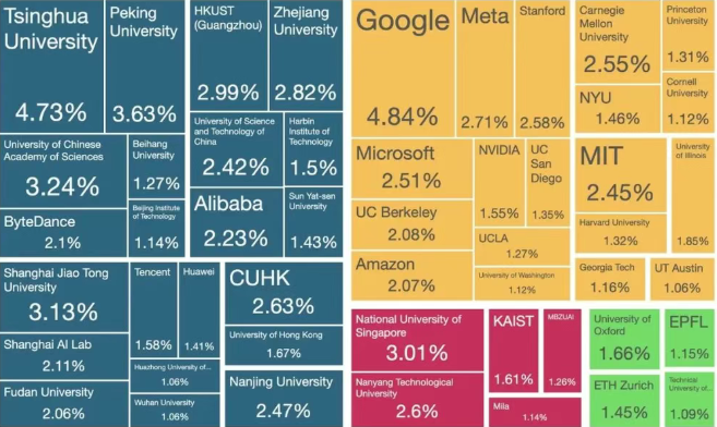 根据AIWorld统计的数据,在NeurIPS 2025中,清华大学以390篇论文、2.18%的占比超越了谷歌,位列全球第一。北京大学、上海交通大学、浙江大学、中国科学院等高校和研究机构也稳居全球前列。此外,腾讯、阿里巴巴、华为等中国企业也贡献了大量高质量的研究成果。
