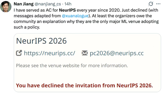 知名强化学习研究者姜楠则宣布退出已经担任多年的审稿工作,她质疑道:"为何NeurIPS要成为唯一推行此类政策的AI顶会?"这一问题戳中了关键——其他AI顶会如ICML、ICLR至今尚未采取类似的歧视性政策。