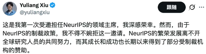 西湖大学助理教授修宇亮婉拒了NeurIPS 2026的领域主席邀请,他在公开回应中指出:"顶会的繁荣离不开全球学者的共同建设,更离不开那些受制裁机构长期以来的大力支持"。这一表态直指问题本质——NeurIPS的国际影响力正是建立在全球学者,包括中国学者的共同贡献之上。
