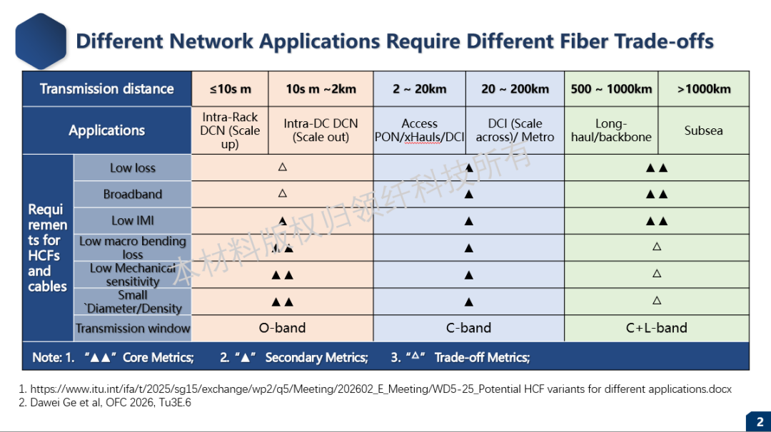 报告首先引用了中国移动在ITU-T 标准课题会议中的讨论,对空芯光纤在不同网络层级中的应用进行了系统划分。从机架内部、数据中心内部,到数据中心互联、城域网,再到跨洲长距离传输,不同距离尺度下的网络,对光纤的“核心诉求”有所不同: