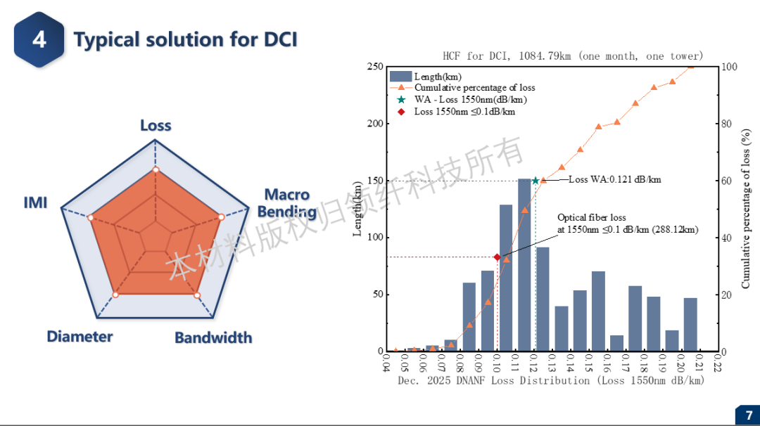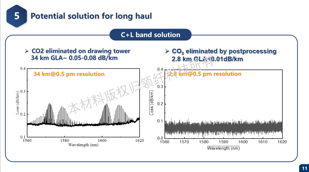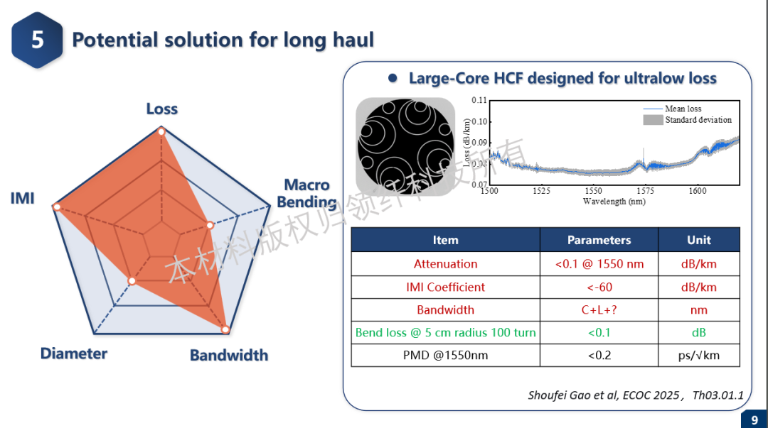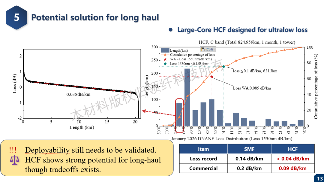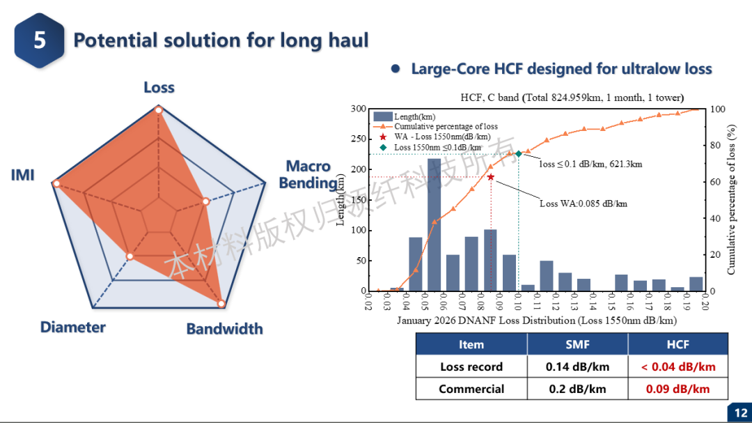 在面向长距离传输的应用中,报告进一步展示了大芯径空芯光纤的性能表现。在连续拉制实验中:最低损耗达到 0.038 dB/km;一个月拉制过程中,加权平均损耗约为 0.085 dB/km; 0.05-0.06 dB/km 的损耗区间,成为产出中的主要集中区域,并对应超过 200 km 的连续长度,这说明,超低损耗已经从“个别最优结果”,转变为可稳定获得的工程水平。与传统单模光纤(SMF)相比:理论极限约 0.14 dB/km,商用水平约 0.2 dB/km,空芯光纤可预期的理论极限为<0.04 dB/km,未来商用水平可能可以达到0.09 dB/km。这对光通信是令人振奋的消息,因为当损耗降低到这一水平后,系统设计的边界开始发生变化:放大器间距可以进一步拉大、系统能耗与复杂度下降、长距离链路的经济性被重新评估。