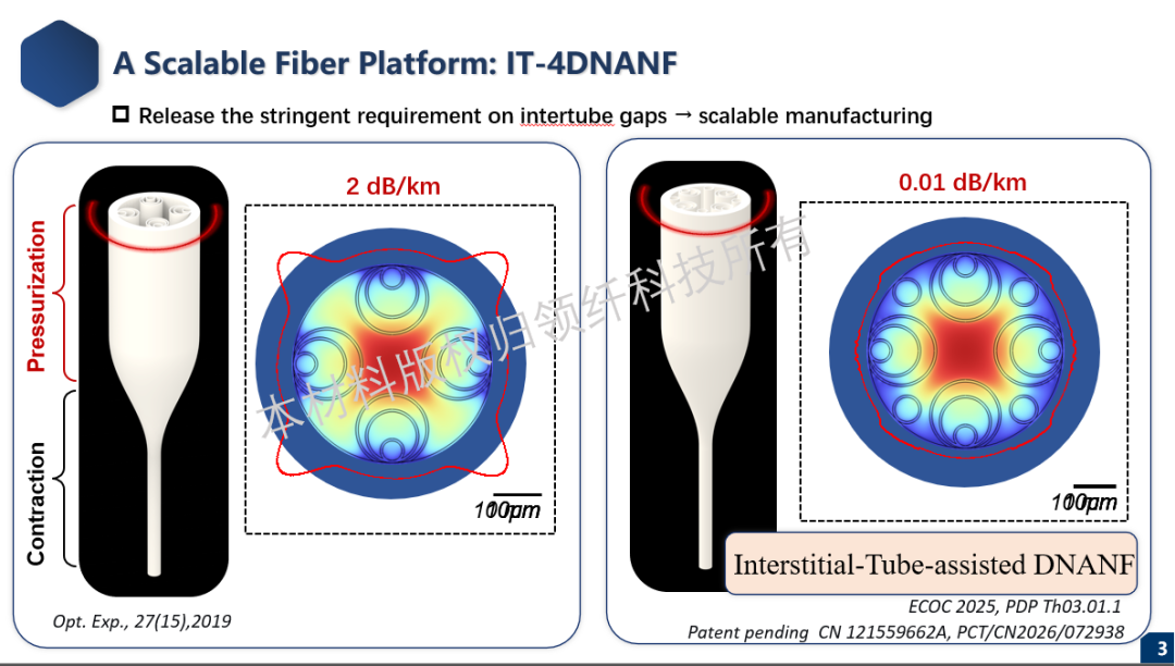 在明确不同应用场景所对应的性能取舍之后,报告进一步强调:领纤科技的设计是统一基于同一技术平台展开——间隙管辅助空芯光纤(IT-DNANF)结构体系。IT-DNANF将原本高度敏感的结构参数解耦,放宽了对管间间隙(intertube gap)的极端制造要求,避免了拉丝过程中的结构接触与失稳问题,为模态控制、损耗优化与结构尺寸调节提供额外自由度,这使得空芯光纤的批量化生产成为可能。同时,IT-DNANF相关结构及其制造方法,已由领纤科技进行了系统性的专利布局,覆盖关键结构设计与工艺实现路径。领纤科技已在2025年9月的欧洲光通信会议(ECOC)PDP section报导了基于IT-DNANF实现的最长单跨拉丝83km和最低衰减0.052 dB/km。