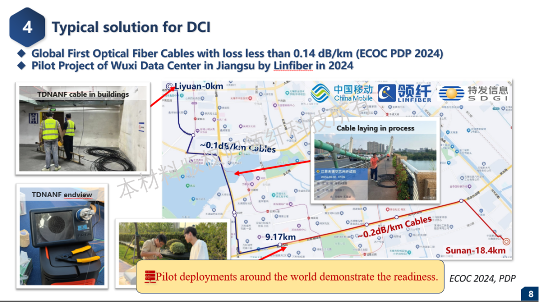 更重要的是,报告展示了其在真实网络中的实际部署:2024年领纤科技在无锡的约20km光缆铺设,覆盖楼宇布线、现场施工以及系统接入等环节,实际链路损耗低于 0.14 dB/km,小于传统光纤损耗极限,这表明,空芯光纤已经可以进入现有通信基础设施体系并稳定运行。与此同时,类似的DCI部署已经在全球多个地区展开,说明空芯光纤已经在DCI实现规模化应用。