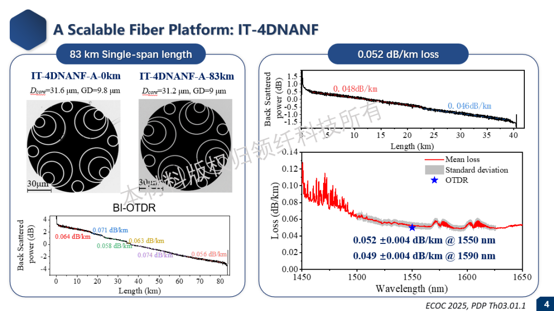 在这一应用目标下,报告进一步展示了领纤科技基于IT-DNANF平台的制造能力:在一台拉丝塔、连续运行一个月的条件下,实现了:累计超过1000 km级别的光纤产出,加权平均损耗约为0.12 dB/km。这表明,在长时间、连续生产条件下,整体性能能够稳定维持在工程可接受范围内。