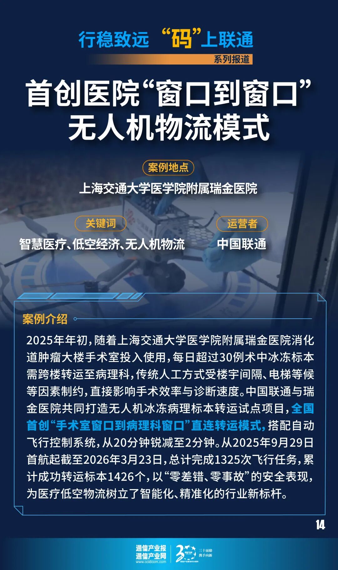 近日,中国联通与上海交通大学医学院附属瑞金医院共同打造的无人机冰冻病理标本转运试点项目交出亮眼答卷——从20分钟锐减至2分钟,术中冰冻病理标本转运实现“空中直达”。全国首创的“手术室窗口到病理科窗口”直连转运模式,搭配自动飞行控制系统,让术中冰冻标本转运效率提升近10倍。从2025年9月29日首航起截至2026年3月23日,总计完成1325次飞行任务,累计成功转运标本1426个,以“零差错、零事故”的安全表现,为医疗低空物流树立了智能化、精准化的行业新标杆。