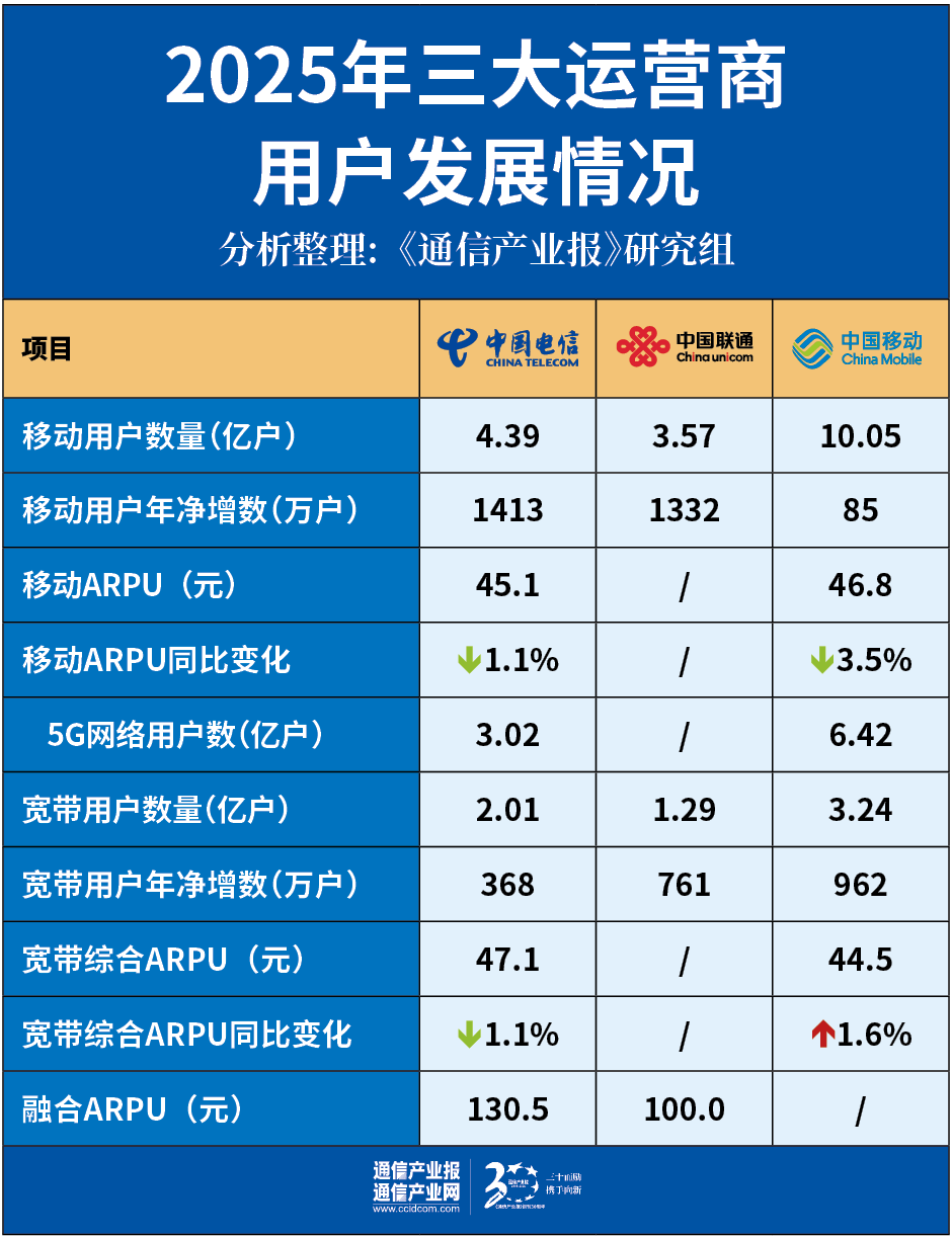 通过智慧化服务的升级,三大运营商用户规模稳步增长。截至2025年末,中国电信移动用户总数达4.39亿户,净增1413万户,其中5G网络用户达3.02亿户,固网宽带用户达2.01亿户,净增368万户,融合ARPU值达到130.5元;中国联通移动用户达3.57亿户,净增1332万户,其中5G网络用户达2.32亿户,固网宽带用户达1.29亿户,净增761万户,融合ARPU值超过100元。中国移动移动用户达10.05亿户,净增85万户,其中5G网络用户达6.42亿户,移动ARPU为46.8元,固网宽带用户达3.24亿户,净增962万户,家庭综合ARPU为44.5元。特别是中国移动公众客群的移宽融合率达到96.5%,创历史新高。