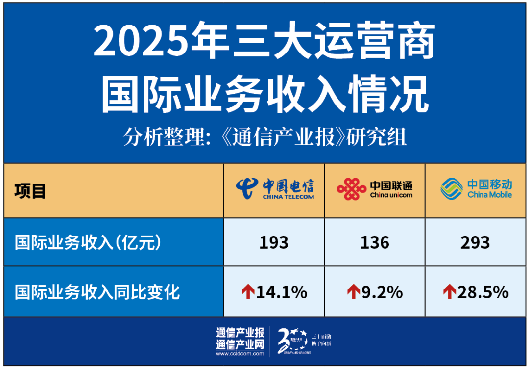 据年报,中国电信国际业务营收达193亿元,同比增长14.1%;中国联通国际业务收入136亿元,同比增长9.2%;中国移动国际收入达293亿元,同比增长28.5%。