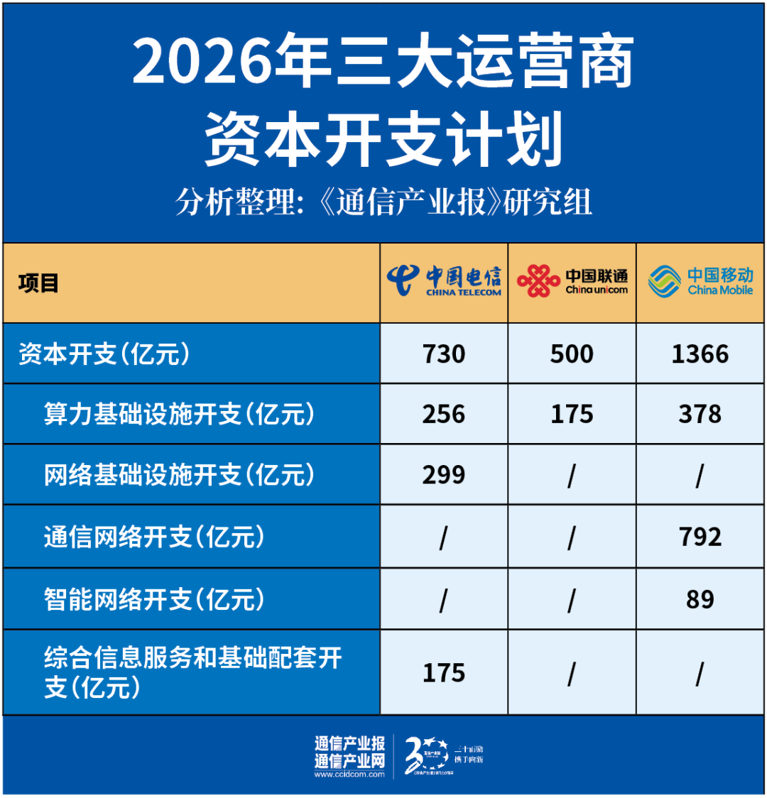 在2025年的基础上,三大运营商在2026年继续压缩资本开支。据年报,中国电信资本开支计划投入730亿元,同比下降9.2%;中国联通资本开支计划投入500亿元,同比下降7.7%;中国移动资本开支计划投入1366亿元,同比下降9.5%。