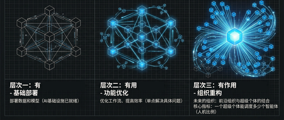真正的“化学反应”意味着什么?我从韦青的演讲中提炼了一个判断框架:技术落地有三个层次:“有”、“有用”和“有作用”。“我也有AI了”是第一层,全公司都买了账号,PPT上多了一个AI标签。“AI帮我省了点事”是第二层,局部效率提升了,但商业模式纹丝未动。“AI改变了我的组织形态和商业逻辑”是第三层,到了这一层,才能说发生了化学反应。
