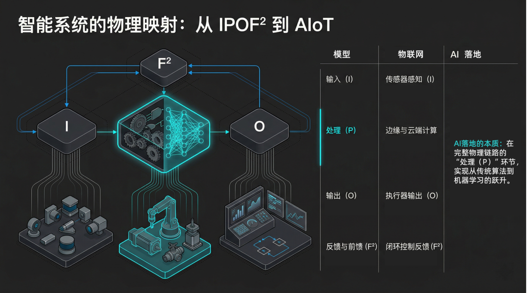 陪跑了物联网十几年,韦青提出的这个模型,不就是物联网的核心架构吗?传感器负责输入,通信网络负责传输,边缘和云平台负责处理,执行器负责输出,闭环控制负责反馈。所谓的AI落地,本质上就是在这条完整链路的“处理”环节,从传统算法升级到了机器学习。