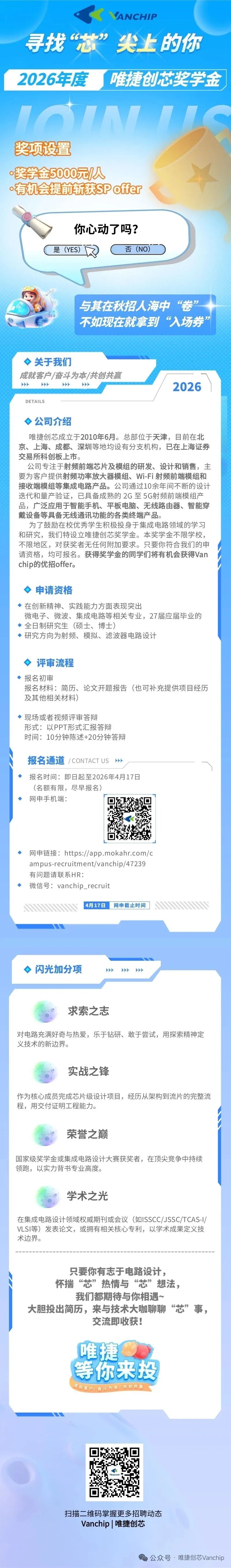 重要提醒:2026唯捷创新奖学金评审通道已正式开启!射频学堂的同学们,不必犹豫,不必观望,赶紧整理好材料,踊跃报名,凭借自己的专业实力斩获荣誉,和射频芯片龙头企业并肩同行,在国产射频芯片发展的道路上,书写属于我们的青春答卷,共筑国产芯片新未来!
