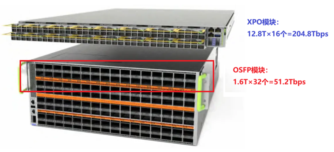 而XPO模块,开放机架1U的空间,能塞入16个模块,但交换容量却能达到204.8Tbps,是OSFP的4倍。