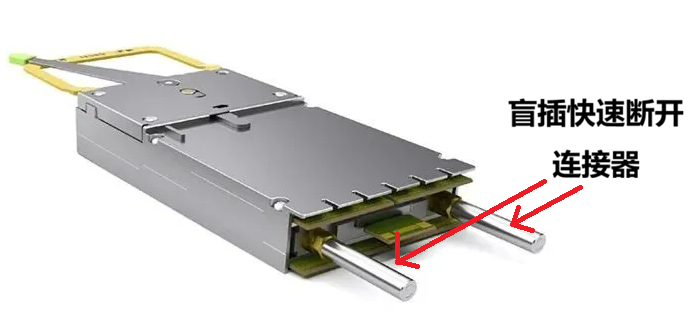 XPO模块尾部的两根金属棒,是盲插快速断开连接器,用于冷却液的进和出: