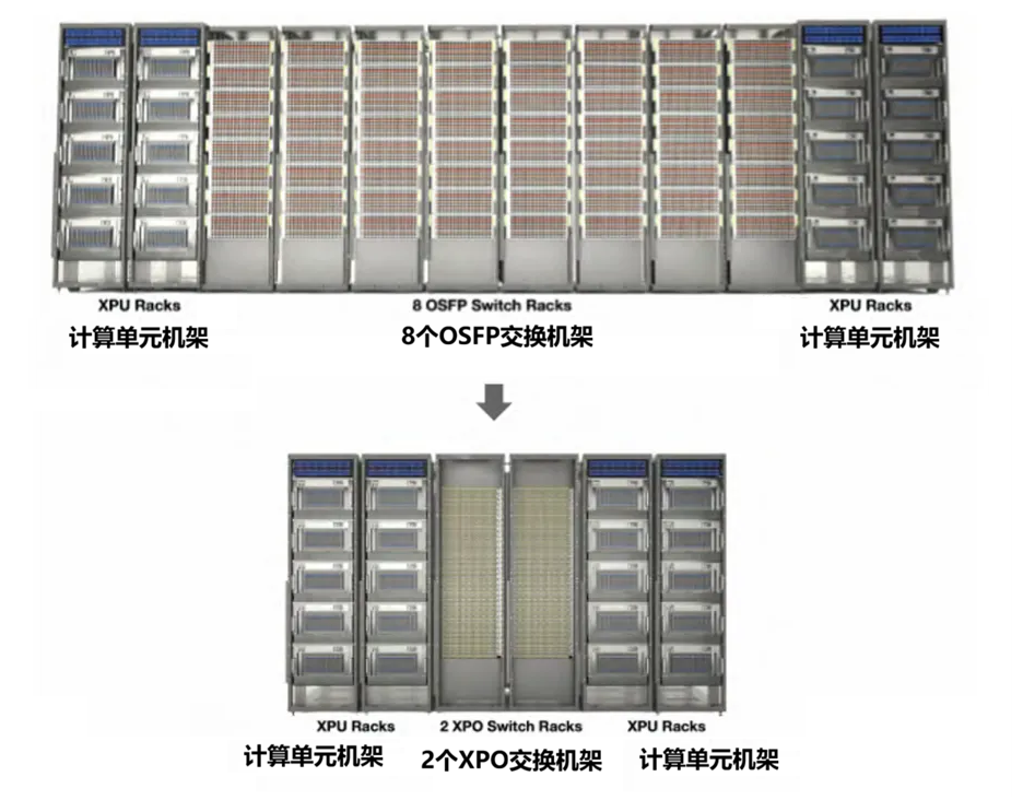 例如,一个400MW的十万卡级智算中心(128000块GPU),如果使用OSFP模块,需要约1408个交换机机架。而使用XPO模块,只需要352个机架。