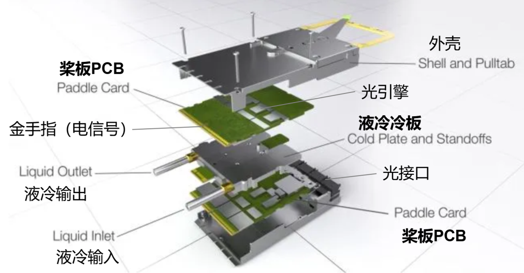 XPO没有采用传统的单PCB布局,而是设计了两块独立的32通道PCB板(桨板),中间夹着一块液冷冷板,有点像“奥利奥饼干”。
