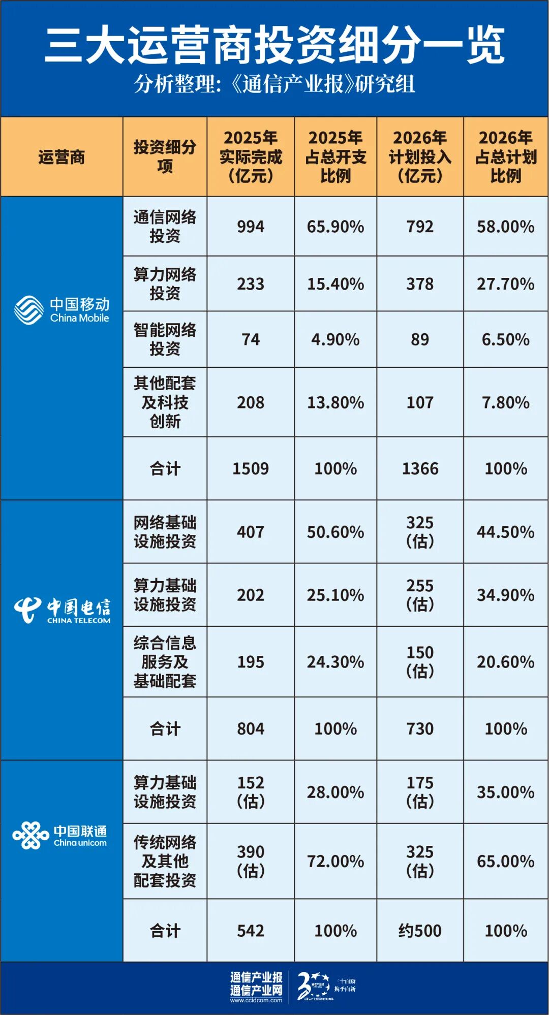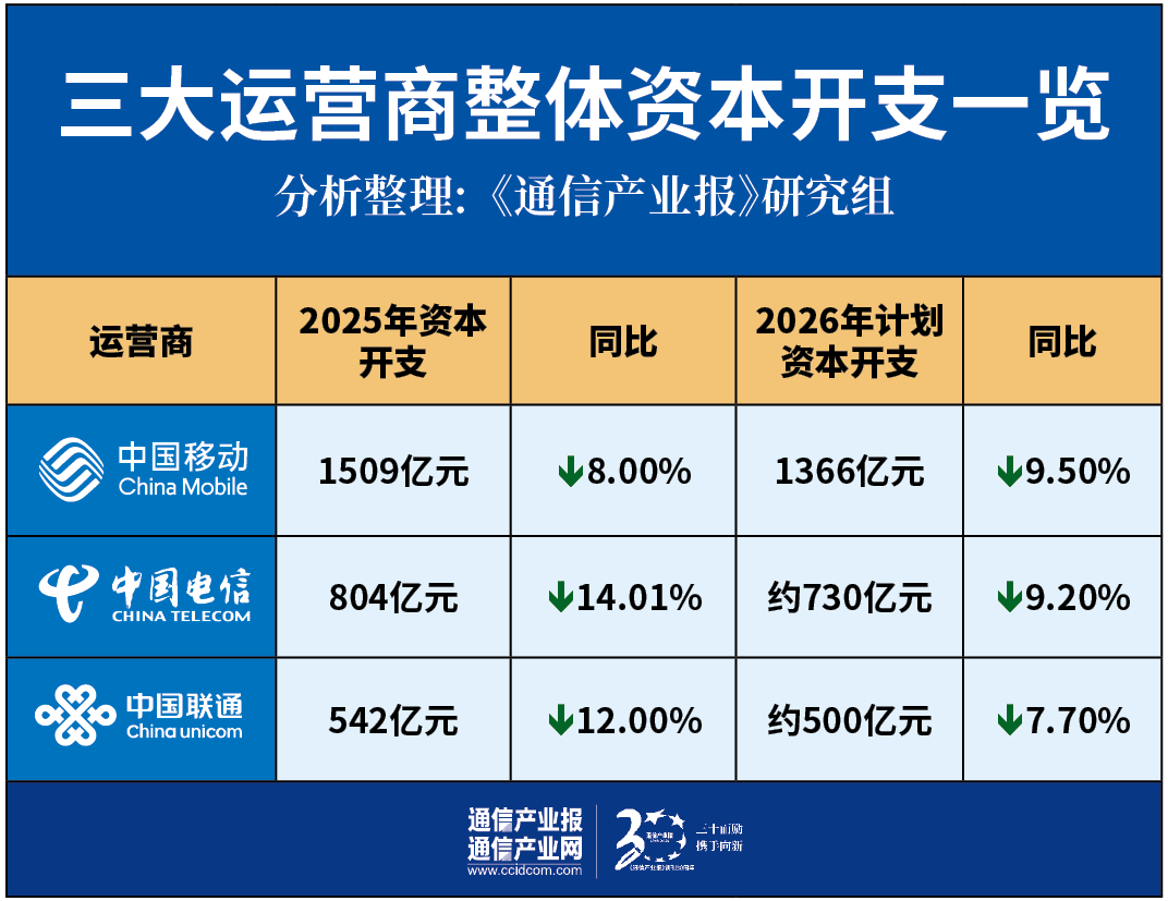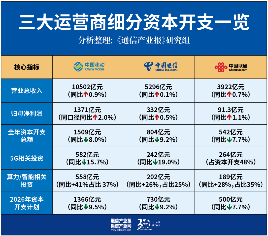 2025年,三大运营商告别了过去5G建设周期中资本开支持续增长的态势,全面进入“总量收缩、结构优化”的精准投资阶段,三家的投资规模与策略呈现出清晰的分化格局。