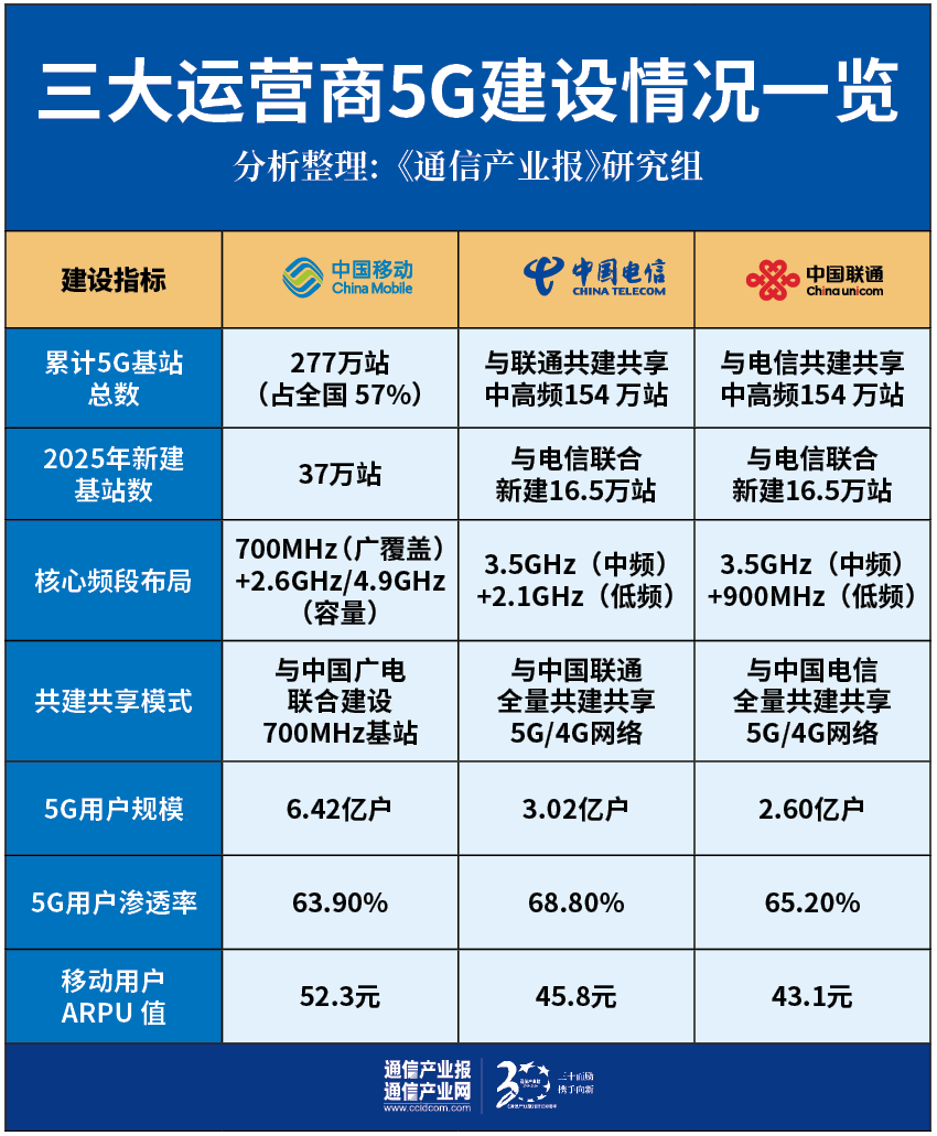 2025年是国内5G规模建设的收官之年,三大运营商的投资重点、无线布局与采购方向均发生了根本性变化,从“覆盖优先”彻底转向“价值优先”,差异化竞争格局进一步固化。
