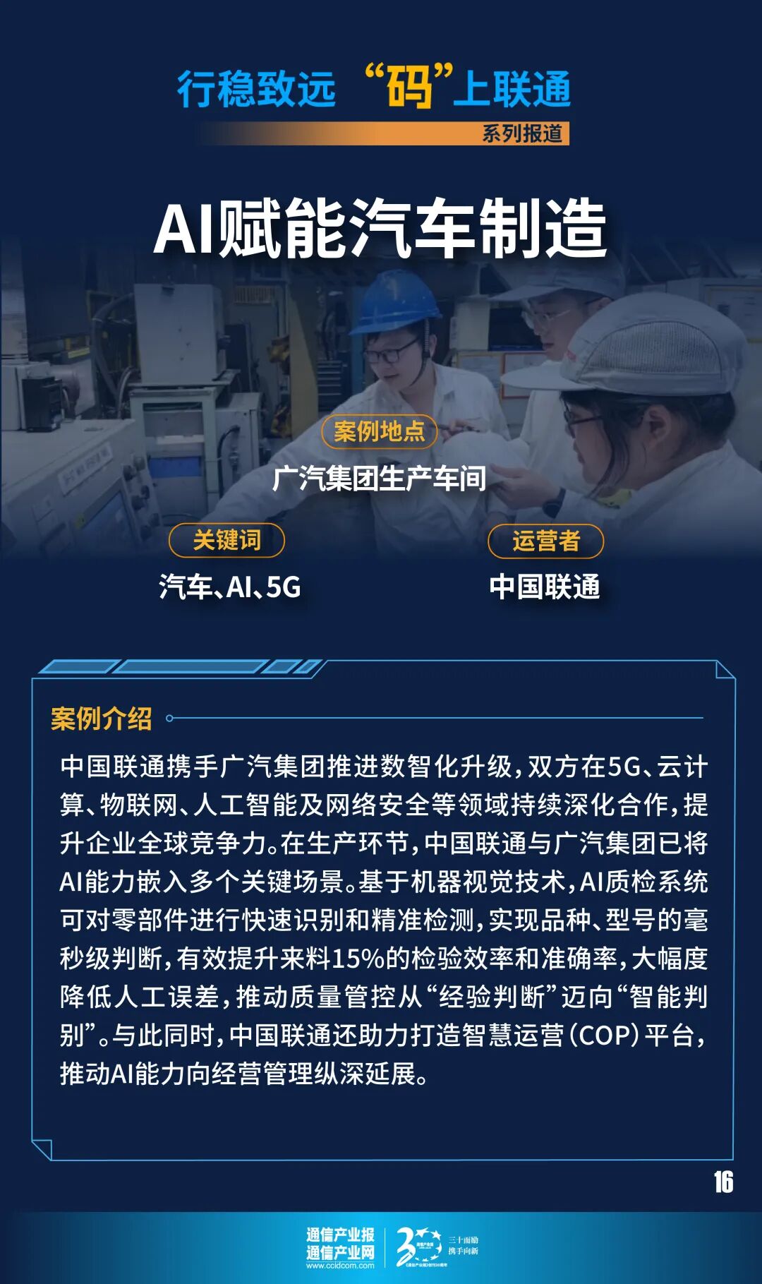 走进汽车生产车间,机械臂起落有序,AGV小车沿着既定路线穿梭往返,设备参数在大屏上实时跃动,质检工位的工业相机正以毫秒级速度“捕捉”每一处细节;在看不见的另一端,5G专网、联通云、AI算法和安全体系如同一套协同运转的“数字神经系统”,贯穿研发、生产、销售、服务全链条,持续为智能汽车制造注入新动能。这些画面不是未来图景,而是中国联通携手广汽集团推进数智化升级的生动实践。双方在5G、云计算、物联网、人工智能及网络安全等领域持续深化合作,不断夯实智造数字底座,为提升企业全球竞争力、推动中国汽车加速驶向世界提供了坚实支撑。