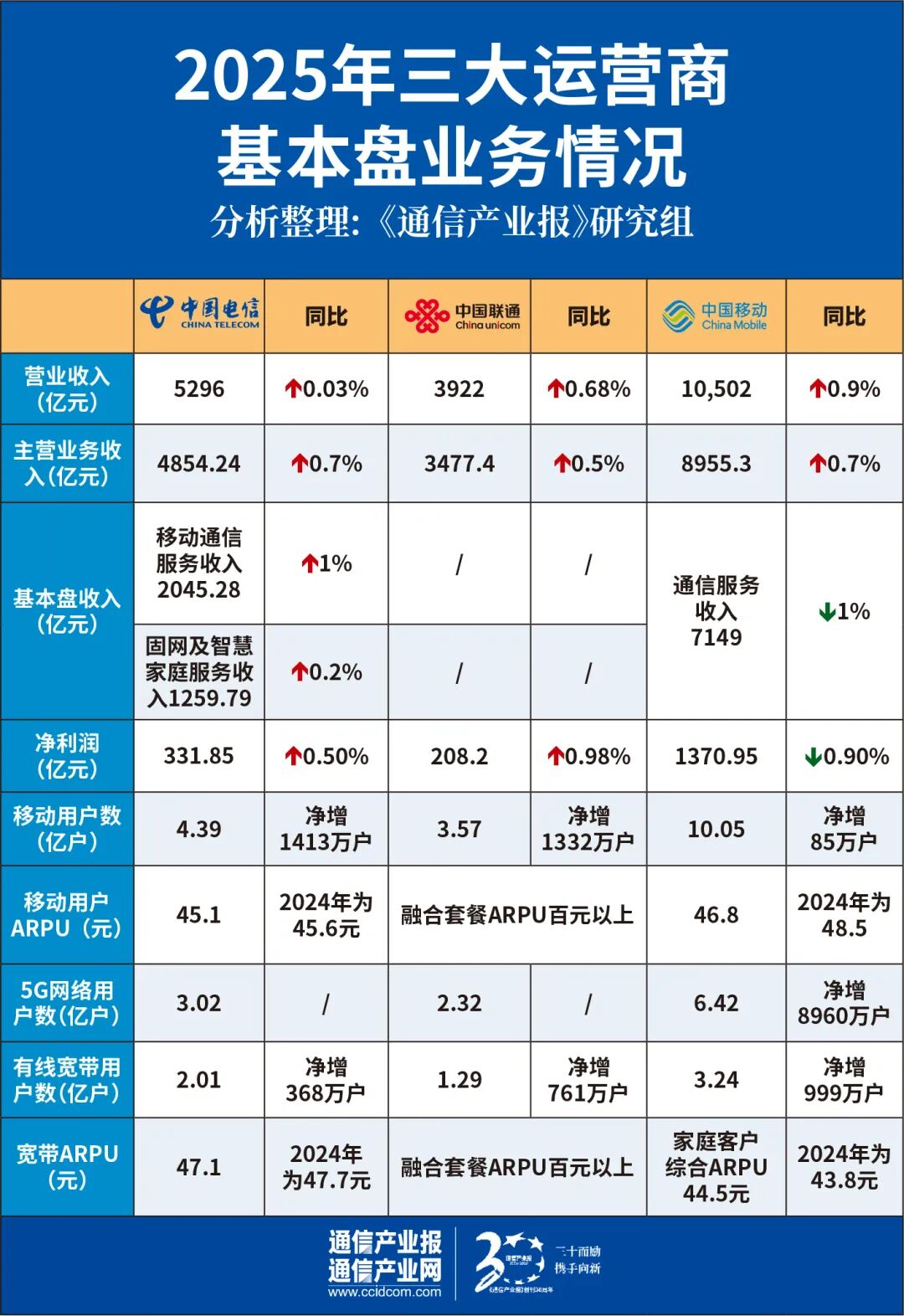 从三大运营商财务基本情况可以看到,其整体增长趋缓已成为一个集体特征。中国电信、中国联通和中国移动主营业务收入分别为4854.24亿元、3477.4亿元和8955.3亿元,同比增长0.7%、0.5%和0.7%。其中,中国电信基本盘业务(移动通信服务收入和固网及智慧家庭服务收入)达3305亿元,同比增0.7%,与主营业务增长持平;中国移动通信服务收入达7149亿元,同比下降1%,与其净利润同比下降0.9%的幅度相接近。可以说,基本盘不稳,运营商整体业务便不会稳,基本盘的稳增长是运营商致胜关键。目前,三大运营商移动用户之和达到18.01亿户,5G用户数之和为11.76亿户,5G用户渗透率达65.3%,有线宽带用户数之和为6.54亿户。传统用户的日趋见顶是否意味着运营商的基本面到达“天花板”?还有没有发展空间?其升维空间在哪里?是值得产业界深思的问题。在用户数饱和的大背景下,三大运营商更加注重连接的拓展、业务的融合、智慧家庭生态构建和“AI+”产品打造。“通信范畴不断拓展,通信网络覆盖从地面延伸到非地面,通信连接从人拓展到人机物乃至智能体。通信服务空间将进一步打开,还没有到‘天花板’。”这是中国移动管理层在中国移动2025年业绩发布会与投资者交流中的表述,更代表了智能时代下,挖掘基本盘业务创新增长中的新动能,成为业绩稳定的“定海神针”。中国移动管理层表示,通信服务空间将进一步打开,还没有到“天花板”。据财报,中国电信、中国联通和中国移动2025年营收增长都在1%以下,基本与上年持平,增速达到历史最低。净利润同样趋缓。中国电信净利润同比增长从2024年的8.43%下降为0.5%;中国联通净利润同比增长0.98%,打破了连续8年双位数增长的历史。尤其是中国移动净利润达同比下降0.9%,是中国移动自2019年以来首次净利下降。在增长趋缓的大背景下,运营商基本盘业务占据重要作用。中国电信基本盘业务为3305亿元,占比主营业务为68.1%;中国移动基本盘业务即通信服务收入达7149亿元,占比主营业务收入为79.8%。运营商基本盘业务关乎全局,其稳定性成为运营商的“压舱石”。中国电信基本盘业务收入较上年同比增长0.7%,其增长高于中国电信第二曲线业务(产业数字化服务收入同比增长0.5%),与主营业务收入增长速度持平。这显示了中国电信基本盘业务的托盘稳定的基础作用。在固网及智慧家庭服务收入中,智慧家庭业务收入达238亿元,同比增长7.6%。“7.6%”的增速远高于基本盘0.7%的增速,显示出家庭业务强劲的发展潜力。运营商经营增长放缓与传统红利消退和市场进入饱和不无关系。2025年移动用户方面,中国电信为4.39亿户,净增1413万户,2024年净增为1675万户;中国联通为3.57亿户,净增1332万户,2024年净增为1068万户;中国移动用户数为10.05亿户,净增85万户,2024年净增为1332万户。中国电信、中国联通和中国移动市场占比分别为24.4%、19.8%和55.8%。中国电信和中国移动的移动用户增长都较上年有所下降。中国电信和中国联的移动用户增长都在千万户级以上,而占比半数市场份额以上的中国移动的用户数增长几乎与上年持平。并且在2025年第一季度和第四季度,中国移动移动用户数出现了下降,这是自2021年1季度移动用户数下降以来又一次出现下降。2025年,三大运营商有线宽带用户数之和为6.54亿户。中国电信、中国联通和中国移动市场占比分别为:30.7%、19.7%、49.6%。中国电信为2.01亿户,较上年净增368万户,2024年净增用户为728万户;中国联通为1.29亿户,净增761万户,2024年净增为884万户;中国移动为3.24亿户,净增999万户,而在2024年为净增1700万户。尤其值得注意的是,2025年第四季度中国移动宽带用户较上季度下降了458万户。这是自2016年中国移动公布宽带用户数以来,首次出现季度用户数下降的情况。由此可见,2025年,三大运营商移动和宽带用户数的净增都有所放缓。这也为运营商基础业务的创新、固移业务融合发展提出了必然要求。用户数量见顶是连接发展的必然趋势,然而,用户数的饱和并不意味着业务价值到顶。那么运营商基本盘还有哪些空间?如何升维?传统用户数代表的连接,正从“人的连接”迈向更宽广的“万物互联”。通信连接的边界正从“人与人”到“人与物”,进一步到“与智能体的交互”。连接形态从移动网、宽带网向物联网、车联网、工业互联网延伸,并朝低空智联网、卫星互联网演进。中国电信移动物联网在车联网、公共服务领域实现用户规模两位数增长。中国联通物联网突破7亿户。联通车联网一体化运营,服务超过9500万车辆。三大运营商获颁卫星通信业务经营许可,北斗短信开启运营,卫星连接用户规模拓展,卫星通信迈入商业化运营阶段。这为运营商传统网络的优势开启新的发展阶段。其次,单纯的用户数不能够体现出运营商在质的方面的提升空间。在套餐形式和设计上,运营商还需提高差异化定价能力,精准覆盖。财报显示,在移动用户ARPU方面,中国电信2025年ARPU为45.1元,较上年减少0.5元;中国联通未公布ARPU数值;中国移动2025年ARPU值为46.8元,较上年减少1.7元。如何提高ARPU值,锁定高净值用户成为下一步面临的挑战。针对高网龄、高ARPU、高信用、高端家庭用户进行画像经营,为其设计专属套餐、提供专属权益和专属服务,分层运营。通过差异化供给,满足高端用户对品质、效率、流量的差异化需求。财报显示,三大运营商5G-A网络在300多城市部